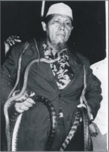 NURHASAN ALUBAIDAH pendiri aliran sesat Islam Jama’ah/ LDII dengan sejumlah ular di tangan dan badannya. Foto: airmatakumengalir